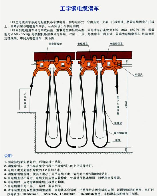 三、ZYGHC型系列工字鋼滑車裝置用于移動供電機(jī)械在移動中電纜的懸吊與移動,已廣泛應(yīng)用于各類起重機(jī)械中。該裝置具有結(jié)構(gòu)堅固。移動靈活。安全可靠等優(yōu)點。